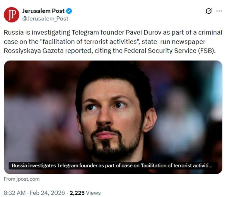 „Acţiunile şefului Telegram, P. Durov sunt investigate în cadrul unui dosar penal pe baza unei infracţiuni prevăzute la articolul 205.1, partea 1.1 (asistenţă la activităţi teroriste) din Codul penal al Rusiei”, a scris Rossiiskaia Gazeta într-un articol care „se bazează pe materiale furnizate de FSB din Rusia”.