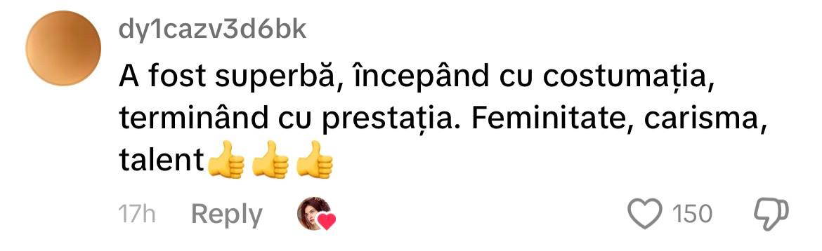 „A fost superbă, începând cu costumața terminând cu prestația. Feminitate, carismă, talent.”