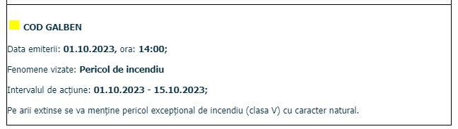 Codul galben de pericol de incendiu a fost prelungit până pe data de 15 octombrie, anunță meteorologii. Astfel, pe arii extinse se va menține pericol excepțional de incendiu (clasa V) cu caracter natural.