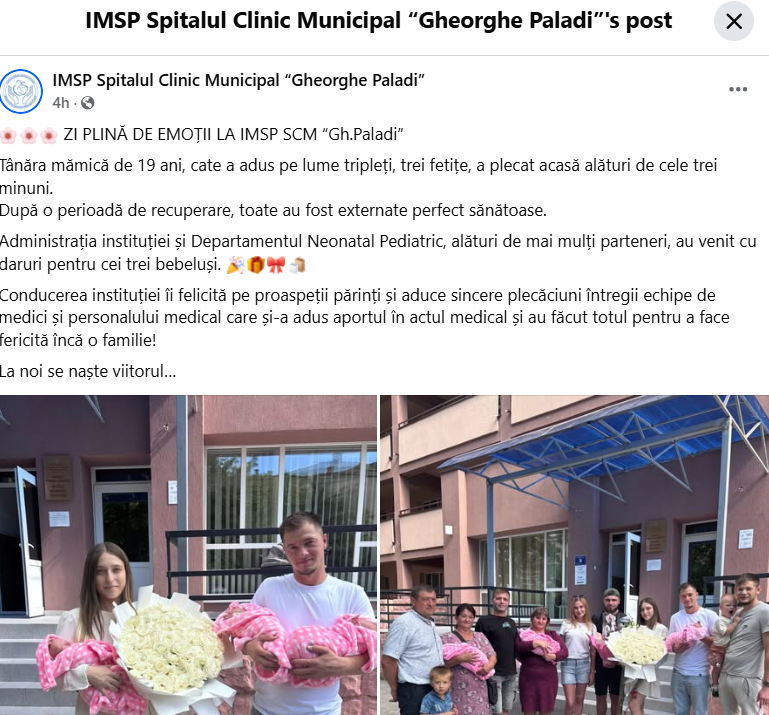 O naștere rară și emoționantă a avut loc în dimineața zilei de 28 iulie 2025, la IMSP Spitalul Clinic Municipal „Gheorghe Paladi” din Chișinău. O tânără mămică de doar 19 ani a adus pe lume tripleți – trei fetițe curajoase și sănătoase, născute prematur, dar în stare stabilă, anunță reprezentanții instituției medicale.