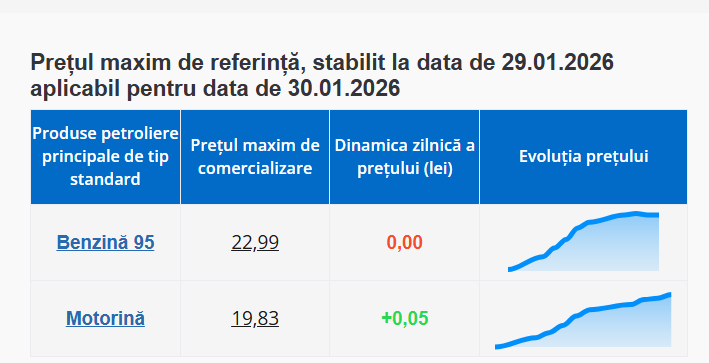 Agenția Națională pentru Reglementare în Energetică (ANRE) a afișat noile prețuri plafon la carburanți pentru mâine, 30 ianuarie. Astfel, motorina va fi mai scumpă cu 5 bani, iar prețul benzinei rămâne neschimbat.