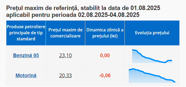 Agenția Națională pentru Reglementare în Energetică (ANRE) a anunțat noile prețuri la carburanți pentru următoarele trei zile, 2-4 august. Astfel, pentru un litru de motorină șoferii vor plăti cu 6 bani mai puțin, iar prețul benzinei rămâne neschimbat.