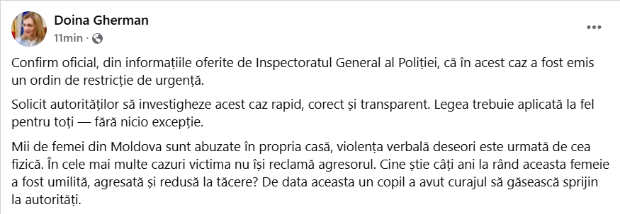 Mii de femei din Moldova sunt abuzate în propria casă, violența verbală deseori este urmată de cea fizică. În cele mai multe cazuri victima nu își reclamă agresorul. Cine știe câți ani la rând aceasta femeie a fost umilită, agresată și redusă la tăcere? De data aceasta un copil a avut curajul să găsească sprijin la autorități”, a scris aceasta pe rețele.