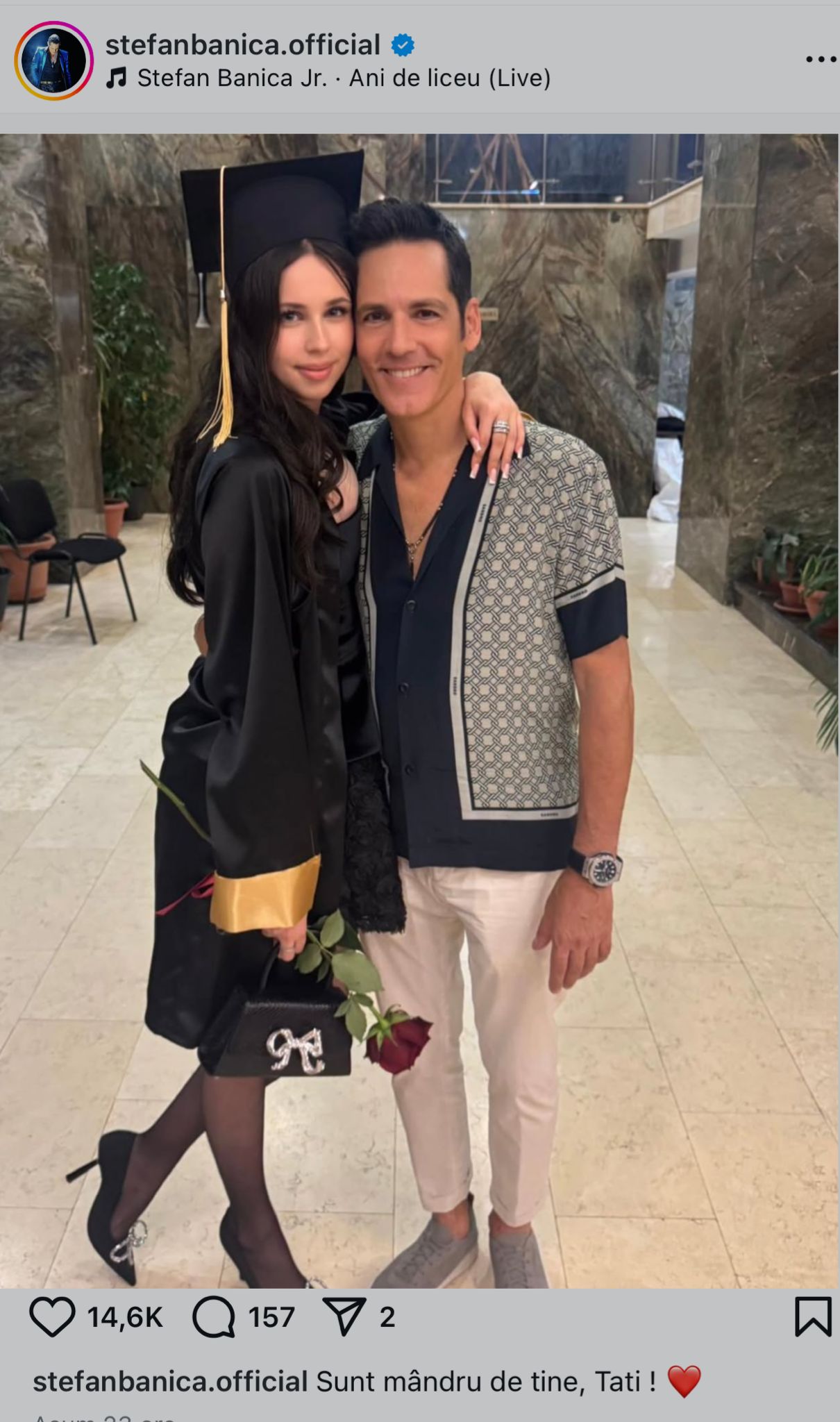 Violeta a terminat cu brio studiile la un liceu internațional de elită din București și urmează să-și continue drumul în America, acolo unde va studia Dreptul. Tânăra a fost sărbătorită cum se cuvinte, iar părinții ei au fost vizibil emoționați și mândri! Ștefan Bănică Jr. este foarte activ pe rețelele de socializare și împărtășește multe momente importante cu persoanele care îl urmăresc în mediul online, așa că a publicat o imagine alături de fiica lui, iar cu această ocazie a transmis că este mândru de ea.