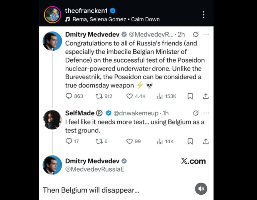 Francken, în încercarea de a-l tempera pe Medvedev, a publicat pe Instagram un mesaj adresat Kremlinului pe melodia „Calm Down” a Selenei Gomez, îndemnând Moscova să „se liniștească”.