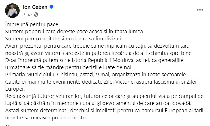 Astăzi suntem determinați, deschiși și implicați pentru ca parcursul European al țării noastre să unească poporul nostru”, a scris Ion Ceban.