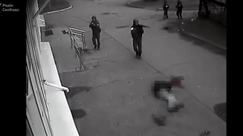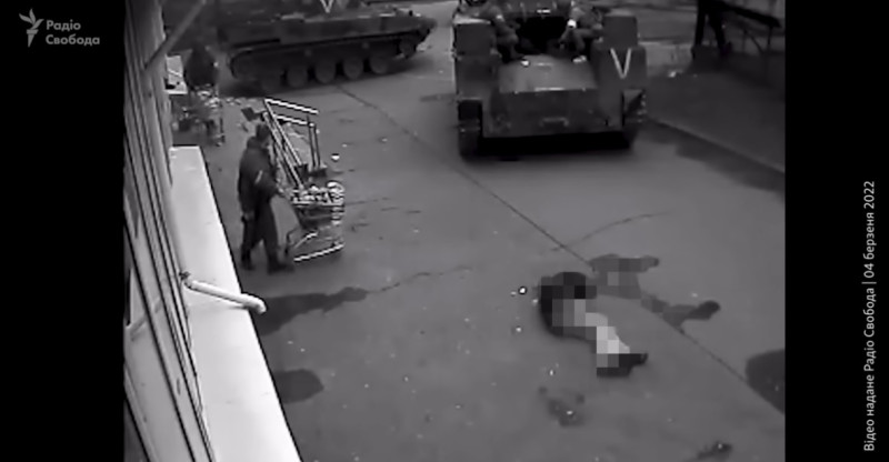 Numele victimei – Volodimir Rubailo. Crima atroce s-a petrecut la 4 martie 2022, pe strada Iablunska din orașul ucrainean Bucea. Imagini ale acestui act barbar, obținute de Radio Liberty Ukraina de pe camerele de supraveghere, au fost date azi publicității.