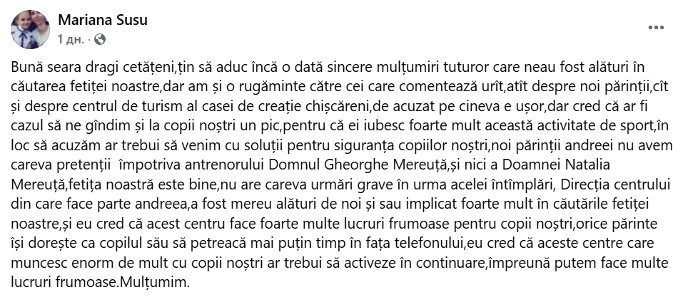 „Bună seara dragi cetățeni, țin să aduc încă o dată sincere mulțumiri tuturor care ne-au fost alături în căutarea fetiței noastre, dar am și o rugăminte către cei care comentează urât, atât despre noi părinții, cât și despre Centrul de Turism al Casei de Creație din satul Chișcăreni.