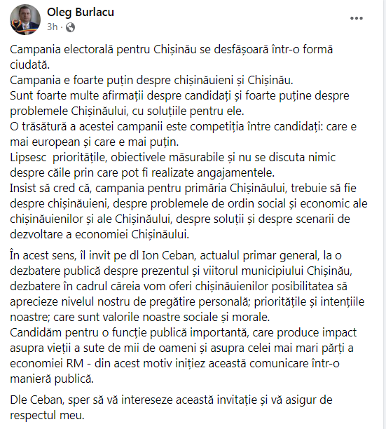 Dle Ceban, sper să vă intereseze această invitație și vă asigur de respectul meu”, scrie Oleg Burlacu.