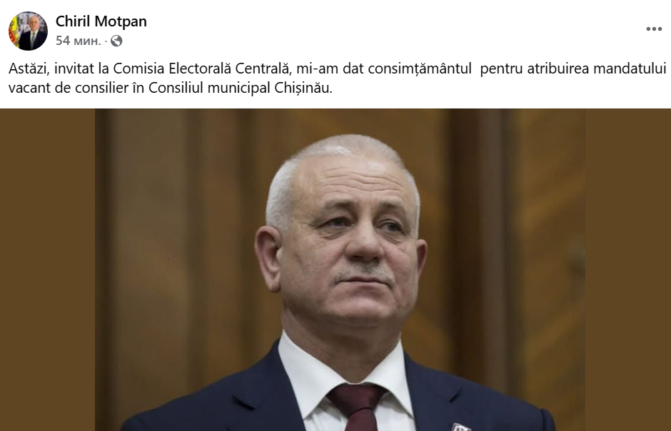 „Astăzi, invitat la Comisia Electorală Centrală, mi-am dat consimțământul pentru atribuirea mandatului vacant de consilier în Consiliul municipal Chișinău”, a scris Moțpan pe rețele.