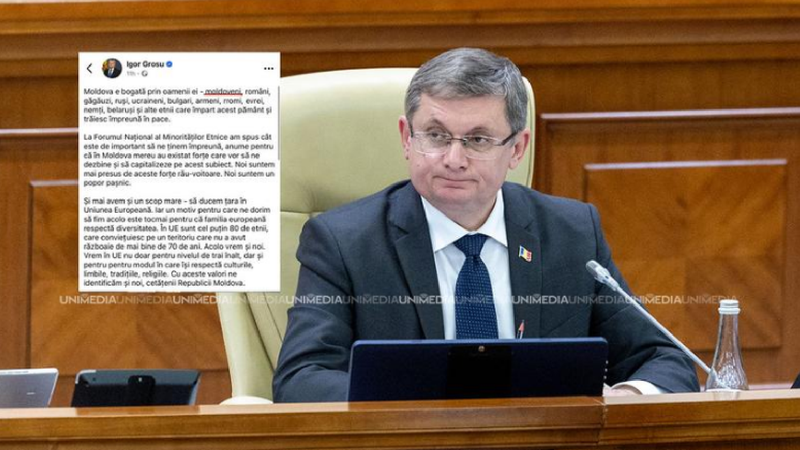Președintele Parlamentului, Igor Grosu, a publicat un mesaj pe rețelele de socializare, după ce a participat la Forumul Național al Minorităților. În textul scris, acesta a divizat moldovenii de români, iar după un val de critici președintele PAS a corectat postarea și a scos virgula între cele două cuvinte, lăsând „moldoveni români”. „Vai de capul tău, Igoraș”, a scris Mihai Ghimpu.