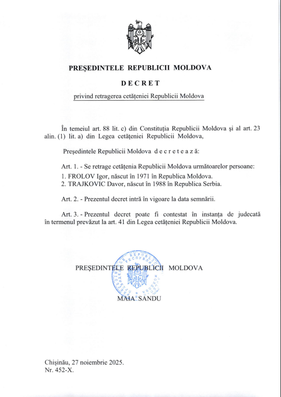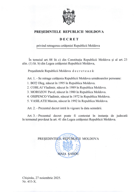 Astfel, potrvit primului decret, a fost retrasă cetățenia Republicii Moldova următoarelor persoane: