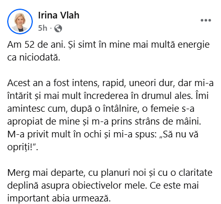Merg mai departe, cu planuri noi și cu o claritate deplină asupra obiectivelor mele. Ce este mai important abia urmează”, a scris politiciana pe rețele.