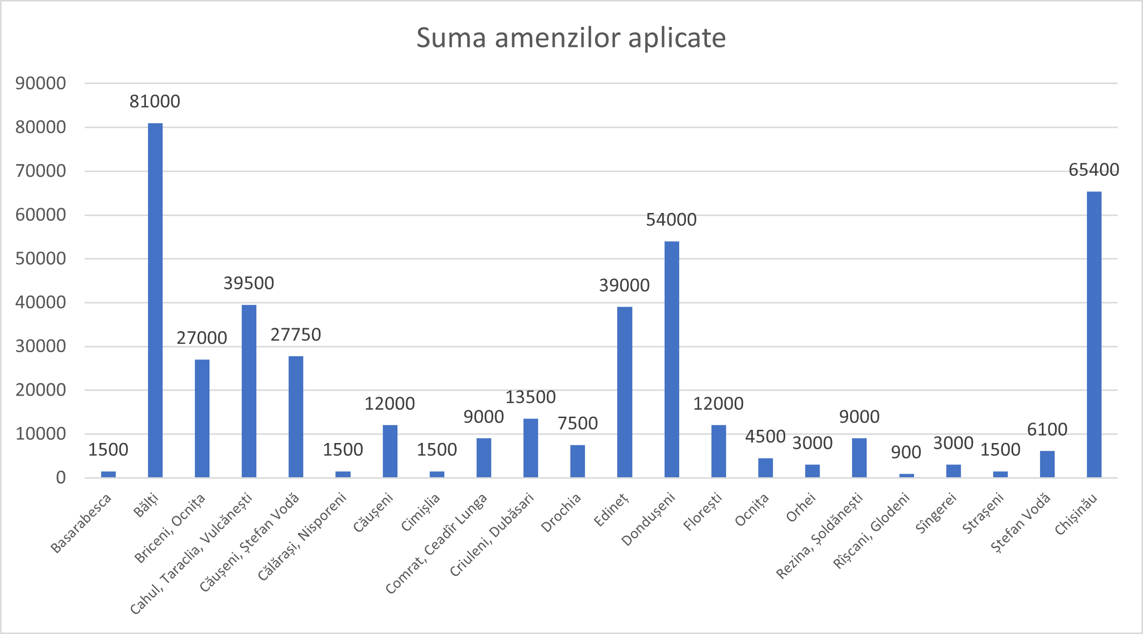 - 260 cazuri de încălcare privind desfășurarea activității de întreprinzător fără a fi înregistrat sub formă organizatorico-juridică, fiind aplicate sancțiuni în sumă de 415,35 mii lei;