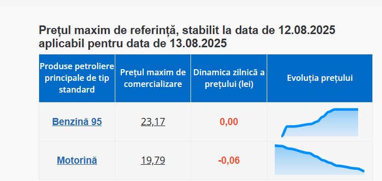 Agenția Națională pentru Reglementare în Energetică a publicat noile prețuri plafon la carburanți pentru 13 august. Astfel, motorina se ieftinește mâine cu 6 bani, în timp ce prețul benzinei rămâne neschimbat.