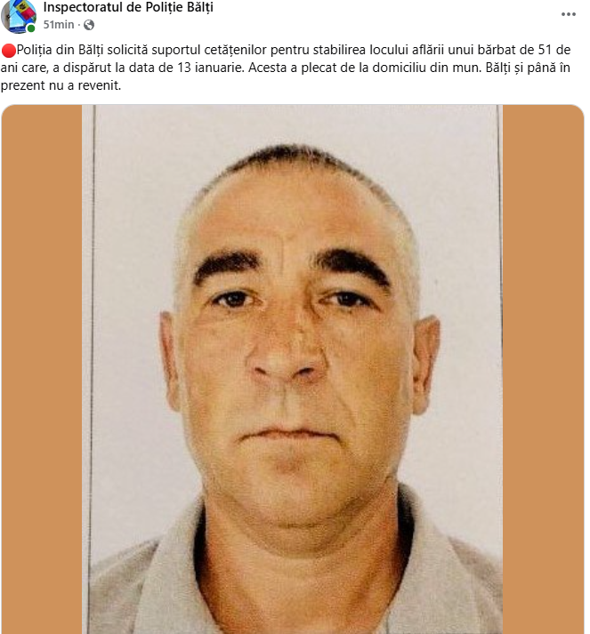 „Dacă aveți informații despre această persoană sau ați observat-o, vă rugăm să contactați imediat Poliția la numerele de telefon: 112, 068976000 sau 069018357”, menționează oamenii legii.