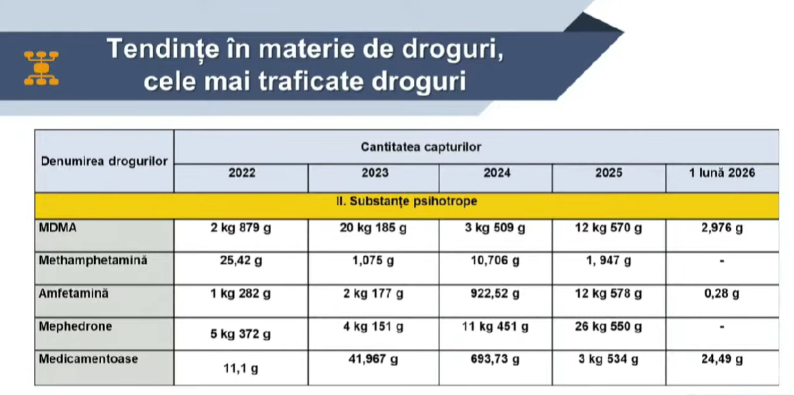 „Conform raportului elaborat și publicat în 2025 de către Organizația Națiunilor Unite în domeniul combaterii drogurilor, se constată o creștere a consumului de droguri la nivel global. Cifrele vorbesc de la sine: de la 246 de milioane de consumatori în 2013, la 316 milioane de consumatori în 2023. Avem o creștere de 28% în 10 ani. Aceste cifre nu sunt doar statistici, ele reflectă presiunea directă asupra sistemului de sănătate, dar și asupra sistemului de securitate publică la nivel global. Și încă doar o cifră din același raport - vorbim despre un cost social de peste jumătate de milion de decese în anul de referință 2021”, a declarat șefa MAI.