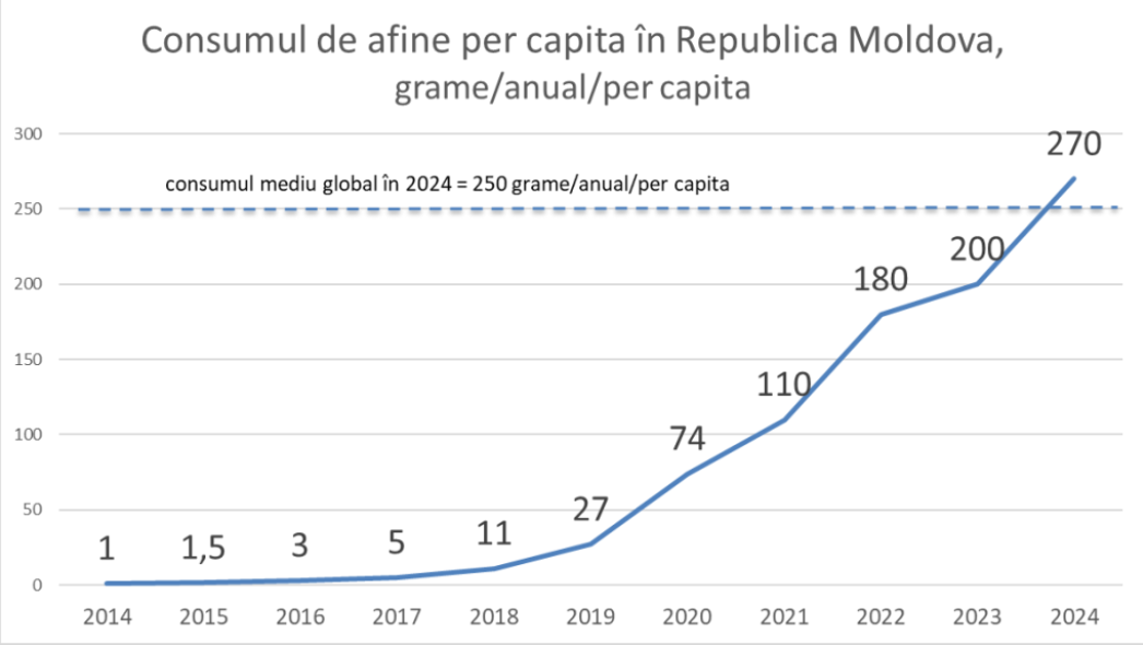 În doar 10 ani, consumul de afine în Republica Moldova a înregistrat o creștere spectaculoasă de la 1 gram per capita în 2014 la 270 grame per capita în 2024, depășind pentru prima dată media globală de 250 grame/an.