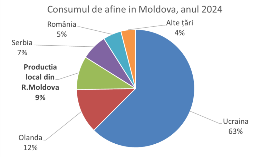 În 2024, piața totală a afinelor consumate în Moldova este estimată la circa 60 milioane lei, însă doar 9% provin din producția locală, restul fiind acoperit de importuri: