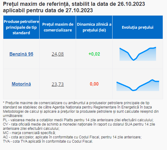 Astfel, 1 litru de benzină va costa mâine 24,08 lei, iar costul motorinei rămâne neschimbat.
