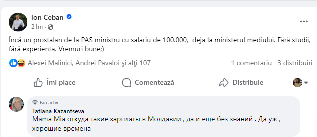 „Încă un prostălan de la PAS ministru cu salariu de 100.000, deja la Ministerul Mediului. Fără studii, fără experiență. Vremuri bune”, a scris Ion Ceban pe pagina sa de Facebook.