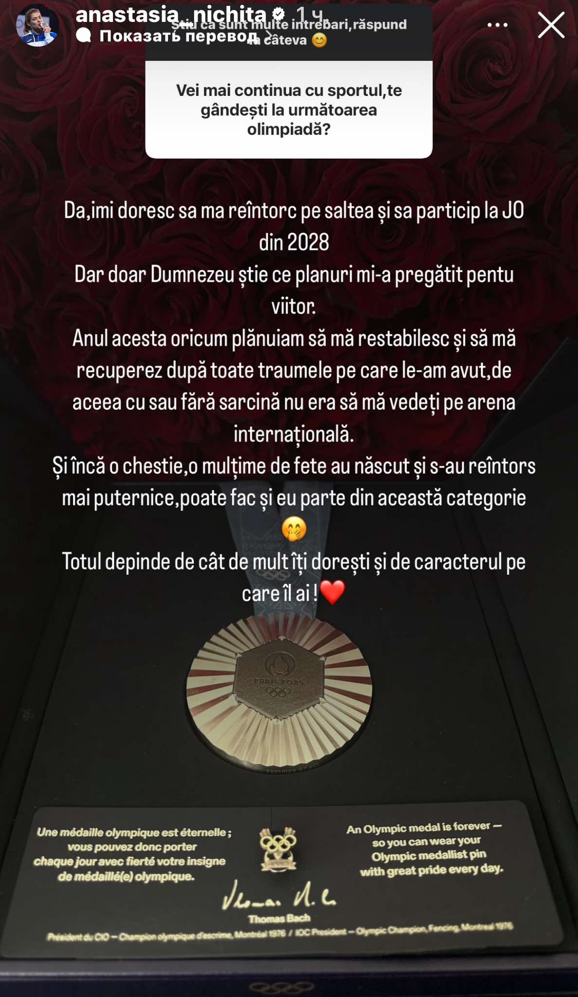 „Da, îmi doresc să mă reîntorc pe saltea și să particip la Jocurile Olimpice din 2028”, a răspuns Anastasia.