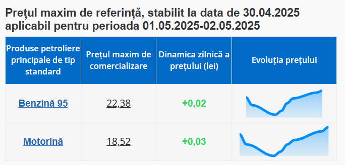 Agenția Națională pentru Reglementare în Energetică (ANRE) a afișat noile prețuri la carburanți pentru următoarele două zile, 1-2 mai. Astfel, benzina va fi mai scumpă cu 2 bănuți, iar prețul motorinei crește cu 3 bani.