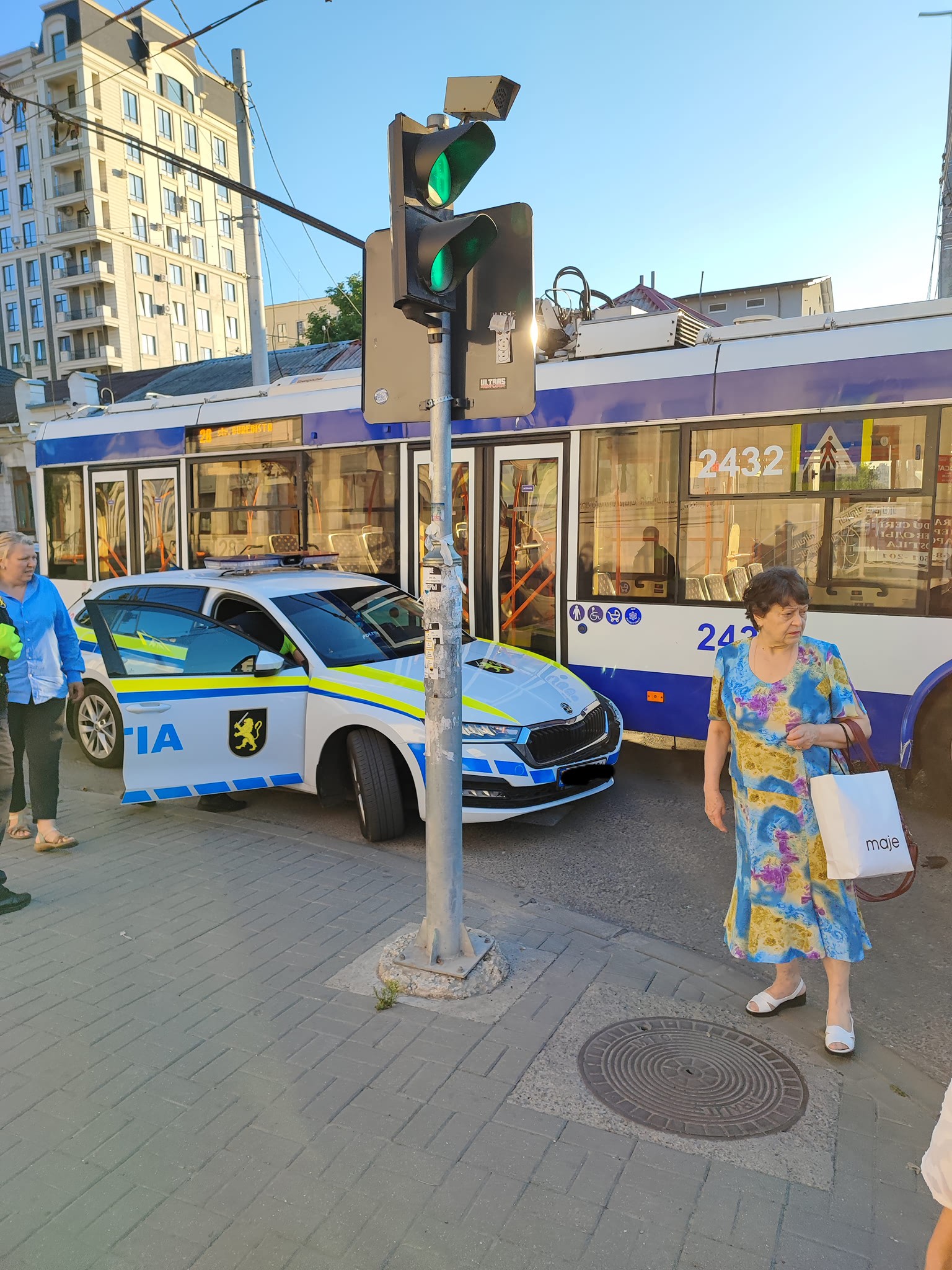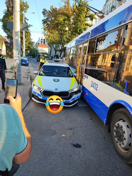 Un accident rutier a avut loc în această dimineață, la intersecția străzii Columna și Vasile Alexandri din capitală. O mașină de poliție s-a lovit de un troleibuz cu pasageri, blocând temporar traficul în zonă.