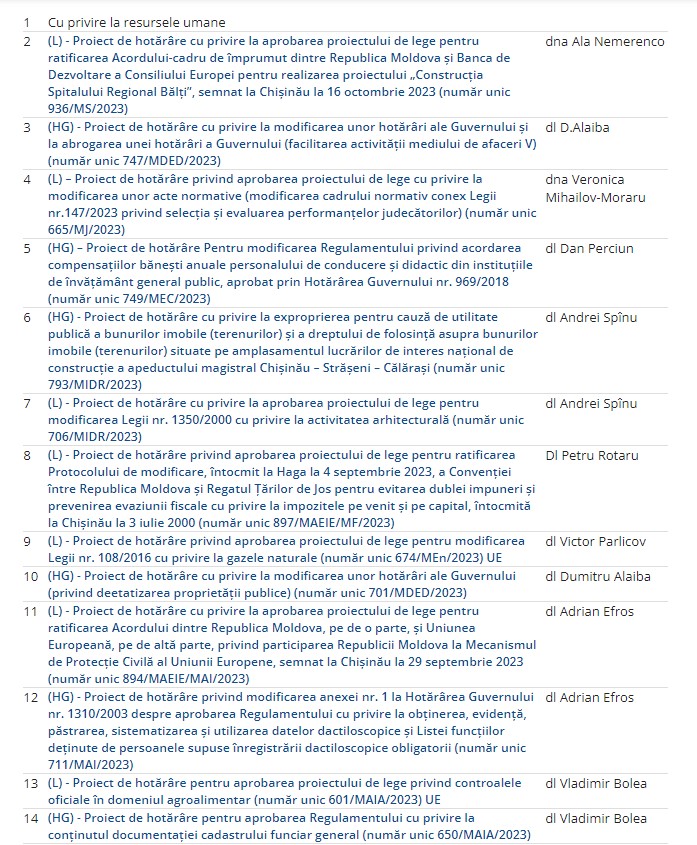 10:22 Adrian Efros a prezentat proiectul de hotărâre cu privire la aprobarea proiectului de lege pentru ratificarea Acordului dintre Republica Moldova, pe de o parte, și Uniunea Europeană, pe de altă parte, privind participarea Republicii Moldova la Mecanismul de Protecție Civilă al Uniunii Europene, semnat la Chișinău la 29 septembrie 2023 și proiectul de hotărâre privind modificarea anexei nr. 1 la Hotărârea Guvernului nr. 1310/2003 despre aprobarea Regulamentului cu privire la obținerea, evidență, păstrarea, sistematizarea și utilizarea datelor dactiloscopice și Listei funcțiilor deținute de persoanele supuse înregistrării dactiloscopice obligatorii. Ambele proiecte, susținute de cabinetul de miniștri.