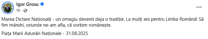 „Marea Dictare Națională - un omagiu devenit deja o tradiție. La mulți ani pentru Limba Română! Să fim mândri, oriunde ne-am afla, că vorbim românește”, a scris Igor Grosu.