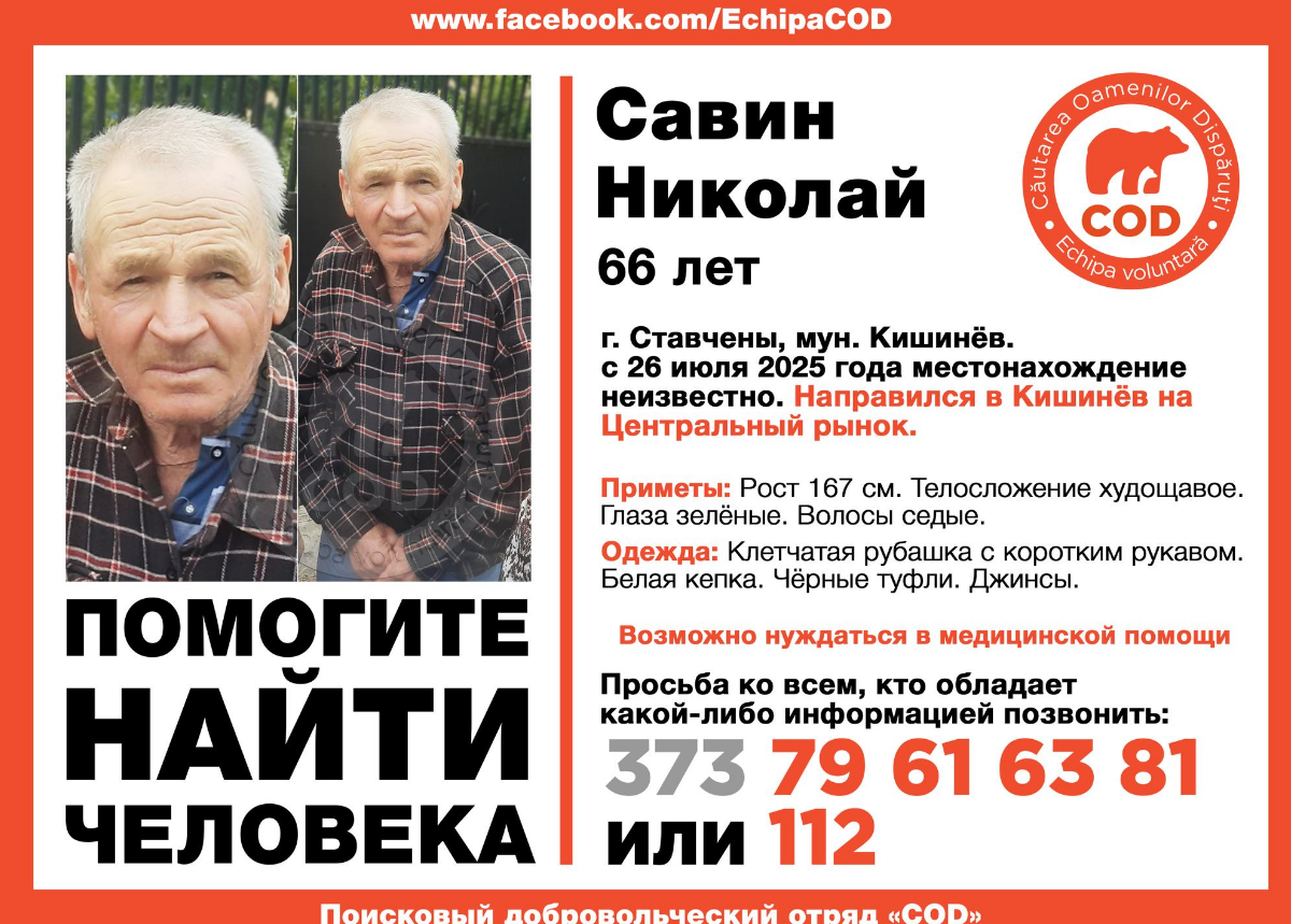 „S-a pierdut o persoană – Savin Nicolae, care a dispărut sâmbătă, 26 iulie, după ce a ieșit la cumpărături în Piața Centrală, Chișinău și de atunci, nu s-a mai întors acasă și familia nu mai are nicio veste de la el.