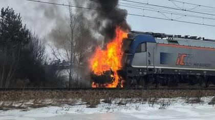 (foto/video) „Am văzut locomotiva în flăcări, iar sub ea o mașină.” Două trenuri cu 600 de oameni la bord s-au ciocnit cu un Ford blocat pe șine, în Polonia