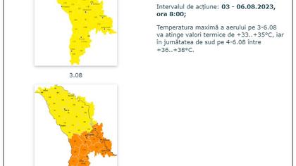 „Astfel, temperatura maximă a aerului în perioada 3-6.08.2023 va atinge valori termice de +33..+35°C, iar în jumătatea de sud pe 4-6.08 între +36..+38°C.