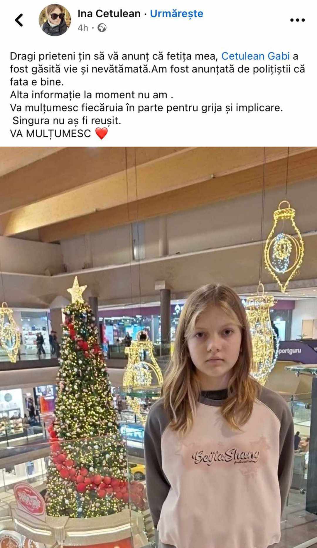 (știrea inițială) „Pe date de 6 februarie, fetița pe nume Cetulean Gabi în vârstă de 12 ani a dispărut fără urmă. Rog persoanele care au cel mai mic indiciul unde s-ar putea afla aceasta fetiță să anunțe imediat poliția.