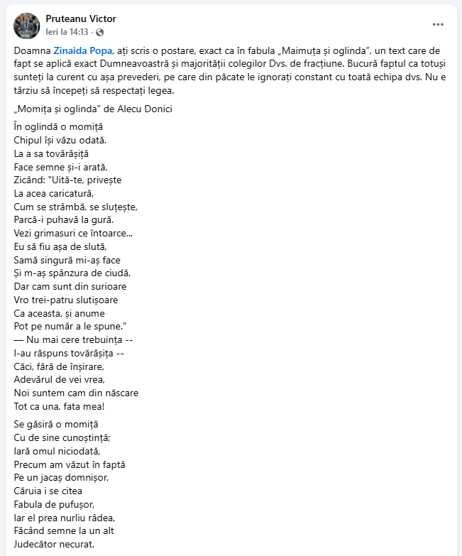 „Doamna Zinaida Popa, ați scris o postare, exact ca în fabula „Momița și oglinda”, un text care de fapt se aplică Dumneavoastră și majorității colegilor Dvs. de fracțiune. Bucură faptul că totuși sunteți la curent cu astfel de prevederi, pe care, din păcate, le ignorați constant cu toată echipa dvs. Nu e târziu să începeți să respectați legea”, a scris Pruteanu, citând ulterior pasaje din fabula menționată.