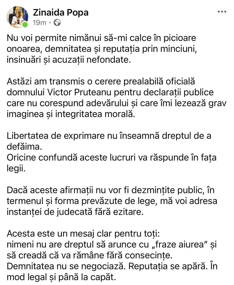 Astăzi am transmis o cerere prealabilă oficială domnului Victor Pruteanu pentru declarații publice care nu corespund adevărului și care îmi lezează grav imaginea și integritatea morală. Libertatea de exprimare nu înseamnă dreptul de a defăima. Oricine confundă aceste lucruri va răspunde în fața legii. Dacă aceste afirmații nu vor fi dezmințite public, în termenul și forma prevăzute de lege, mă voi adresa instanței de judecată fără ezitare.