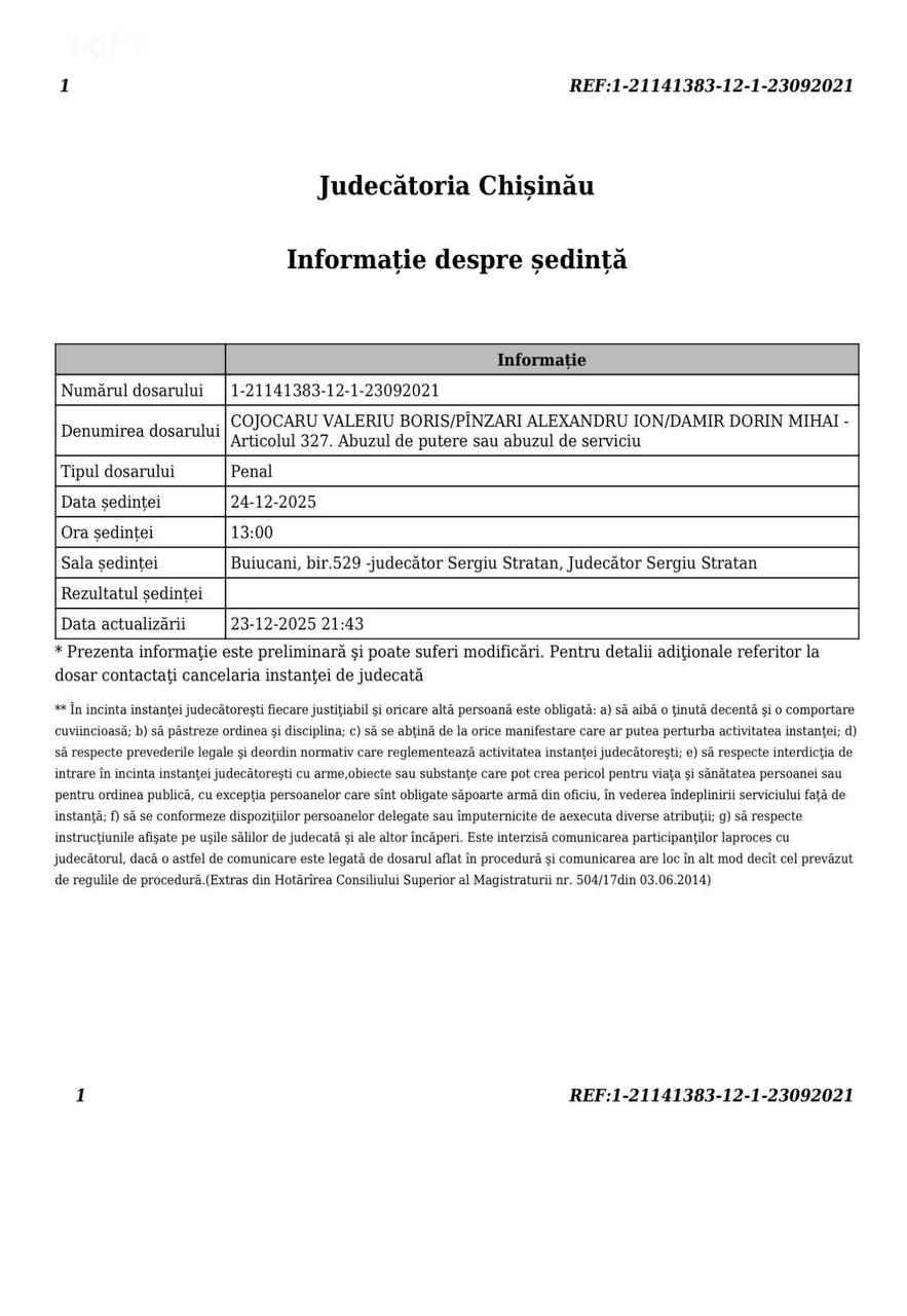 Pe 21 septembrie 2021, prima ședință de judecată în dosarul Direcției 5, în care figurează fostul șef al Inspectoratul General al Poliției (IGP), Alexandru Pînzari, șeful suspendat al IP Bălți, Valeriu Cojocaru, și președintele asociației FEA, Dorin Damir, la Judecătoria Chișinău, sediul Buiucani, a fost amânată.