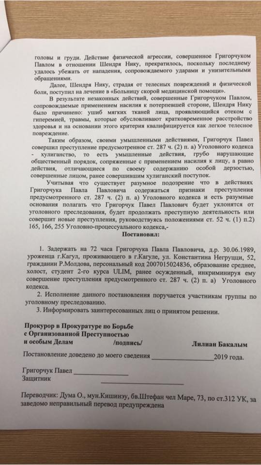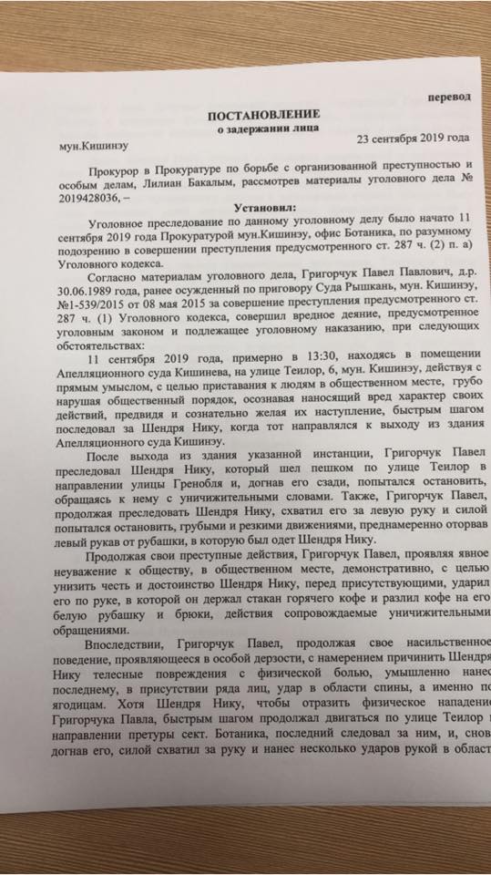 De asemenea, Grigoriuc a publicat câteva imagini video în momentul în care ofițerii PCCOCS „bat la ușă” și ordonanța de reținere ce a fost semnată de procurora Lilian Bacalîm.