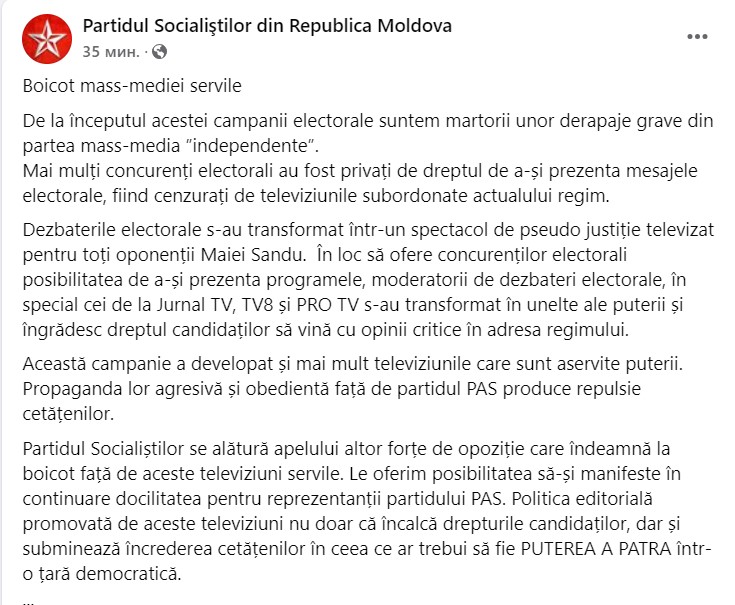 Partidul Socialiștilor se alătură apelului altor forțe de opoziție care îndeamnă la boicot față de aceste televiziuni servile. Le oferim posibilitatea să-și manifeste în continuare docilitatea pentru reprezentanții partidului PAS. Politica editorială promovată de aceste televiziuni nu doar că încalcă drepturile candidaților, dar și subminează încrederea cetățenilor în ceea ce ar trebui să fie Puterea a Patra într-o țară democratică”, comunică PSRM.