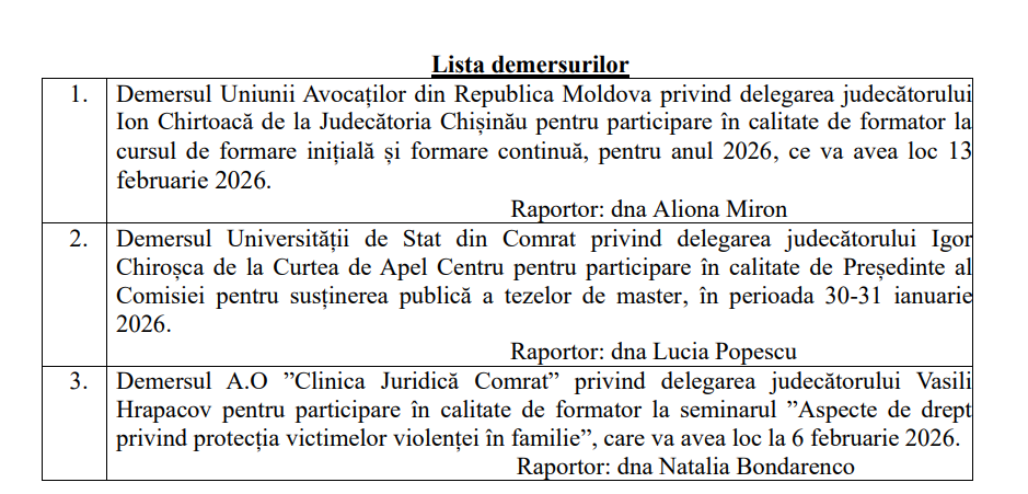 update CSM a aprobat demersul președintelui interimar al Judecătoriei Bălți, Ion Pâcaleu, privind menținerea împuternicirilor judecătoarei Hristina Craveț pentru examinarea unor cauze aflate în procedură.