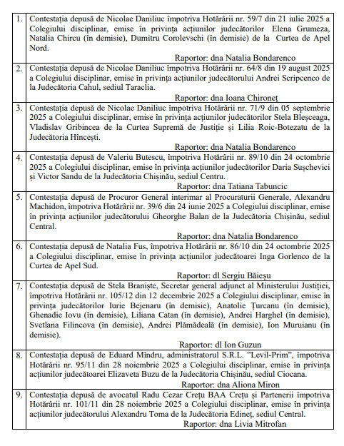 update CSM s-a retras în deliberare pe contestațiile depuse de inspectorul-judecător principal, Diana Ioniță, și membrul CSM, Ion Guzun, împotriva Hotărârii nr. 13/9 din 05 septembrie 2025 a Colegiului disciplinar, emise în privința acțiunilor judecătorului Victor Sîrbu de la Judecătoria Chișinău, sediul Centru.