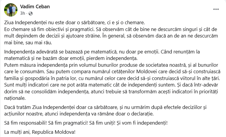 Primarul capitalei, Ion Ceban, a transmis un mesaj video cu ocazia celei de-a 34-a aniversări a Independenței Republicii Moldova. În mesaj, edilul a îndemnat cetățenii să se unească și să contribuie la consolidarea unei națiuni puternice, încheind cu urarea: „La mulți ani, draga mea Patrie!”