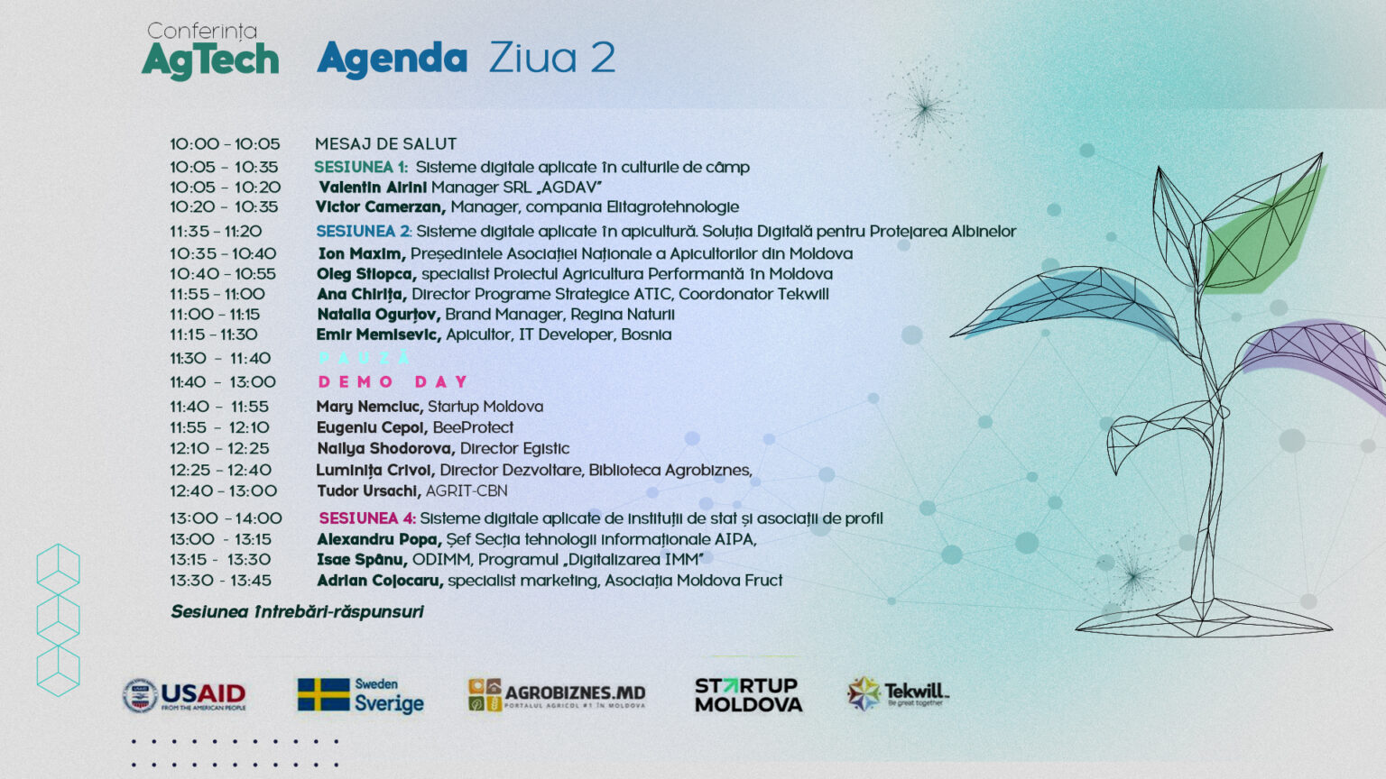 AgTech / Sursa:TekwillÎn acest context, susținerea agriculturii de performanță este una dintre cele 5 verticale de afaceri pe care TEKWILL le susține în cadrul Programului Național „Startup Moldova” Digital Impact – o platformă care vine să încurajeze colaborarea sectorială dintre reprezentanții industriilor tradiționale și cei din IT. Câteva dintre inițiativele care s-au bucurat de suportul proiectului vor fi prezentate în cadrul celei de-a doua zi a Conferinței „AgTech”. În data de 3 martie, participanții la eveniment vor avea posibilitatea să afle de la reprezentanții Agenției de Intervenție și Plăți în Agricultură cum funcționează sistemul online de depunere a dosarelor pentru facilitarea obținerii actelor pentru diferite sevicii. Cele mai mari rețele de retail din țară vor povesti despre experiența sistemelor și proceselor de plăți, iar specialiștii străini vor relata despre experiența lor în trecerea de la agricultura tradițională la cea de performanță. De asemenea, în premieră, conferința va deschide ușile spre noile inovații în domeniul AgTech și va oferi posibilitatea startuperilor să-și prezinte produsele publicului, în cadrul „Demo Day”. Astfel, participanții evenimentului vor stabili conexiuni durabile cu jucătorii ecosistemului, mentori, sponsori și potențiali utilizatori ai produsului.