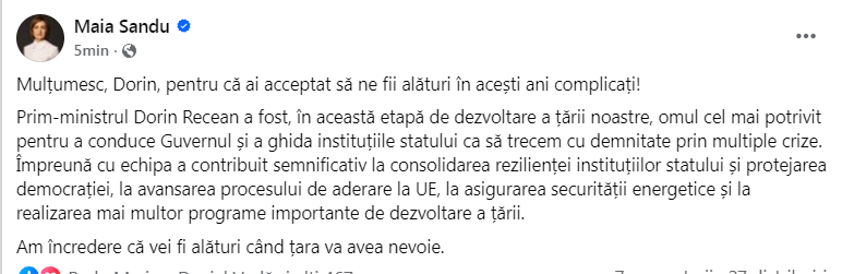 Prim-ministrul Dorin Recean a fost, în această etapă de dezvoltare a țării noastre, omul cel mai potrivit pentru a conduce Guvernul și a ghida instituțiile statului ca să trecem cu demnitate prin multiple crize. Împreună cu echipa a contribuit semnificativ la consolidarea rezilienței instituțiilor statului și protejarea democrației, la avansarea procesului de aderare la UE, la asigurarea securității energetice și la realizarea mai multor programe importante de dezvoltare a țării.