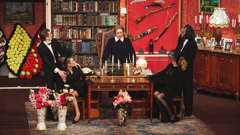 Spectacolul lui Pierre Chesnot, în regia lui Petru Vutcărău, explorează aventurile unei adunări neașteptate la înmormântarea unui romancier bogat.