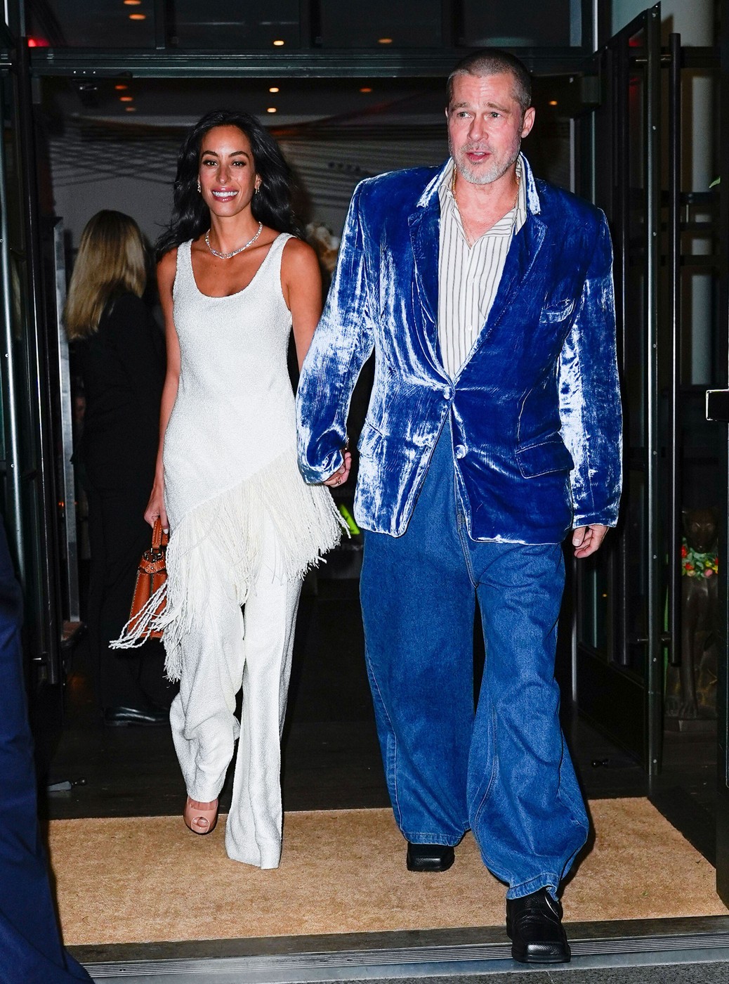 Tuns scurt, în stilul Fight Club, actorul a etalat un sacou vibrant din catifea albastră, alături de o cămașă în dungi, blugi largi și pantofi negri. Nici partenera sa nu s-a lăsat mai prejos.