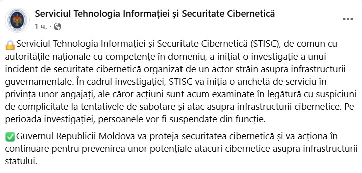„Serviciul Tehnologia Informației și Securitate Cibernetică (STISC), de comun cu autoritățile naționale cu competențe în domeniu, a inițiat o investigație a unui incident de securitate cibernetică organizat de un actor străin asupra infrastructurii guvernamentale. În cadrul investigației, STISC va iniția o anchetă de serviciu în privința unor angajați, ale căror acțiuni sunt acum examinate în legătură cu suspiciuni de complicitate la tentativele de sabotare și atac asupra infrastructurii cibernetice. Pe perioada investigației, persoanele vor fi suspendate din funcție.