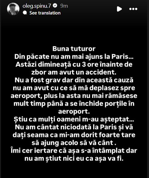Știu că mulți oameni m-au așteptat. Nu am cântat niciodată la Paris și vă dați seama cât de mult mi-am dorit să ajung acolo să vă cânt. Vă cer iertare că s-a întâmplat așa, dar nici eu nu știam că va fi așa”, a scris Oleg Spînu.
