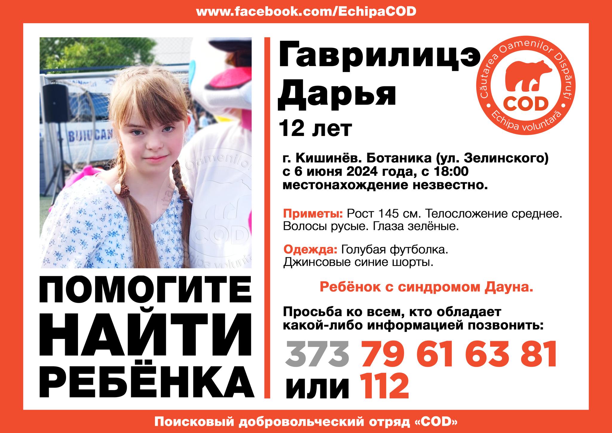 O copilă de 12 ani este căutată cu disperare, după ce acum patru ore a dispărut fără urmă de pe strada Nicolae Zelinski din sectorul Botanica al capitalei. Despre dispariția fetiței a anunțat echipa de căutare „COD”, care cere ajutorul oamenilor pentru a o găsi.