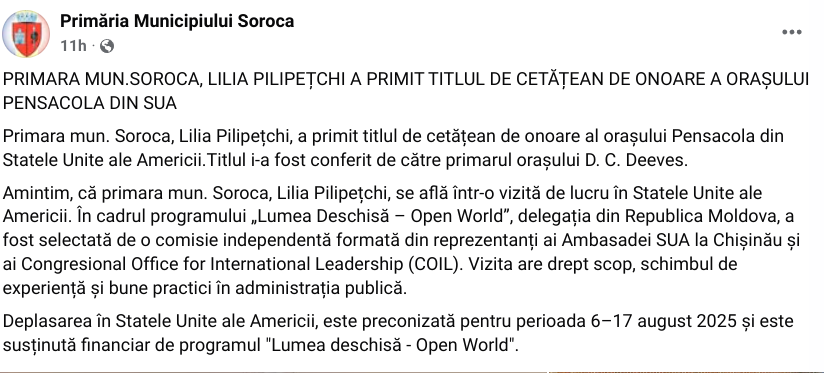 Primărița municipiului Soroca, Lilia Pilipețchi, se află într-o vizită de lucru în Statele Unite ale Americii. În cadrul programului „Lumea Deschisă – Open World”, delegația din Republica Moldova, a fost selectată de o comisie independentă formată din reprezentanți ai Ambasadei SUA la Chișinău și ai Congresional Office for International Leadership (COIL). Vizita are drept scop, schimbul de experiență și bune practici în administrația publică”, a scris Primăria municipiului Soroca.